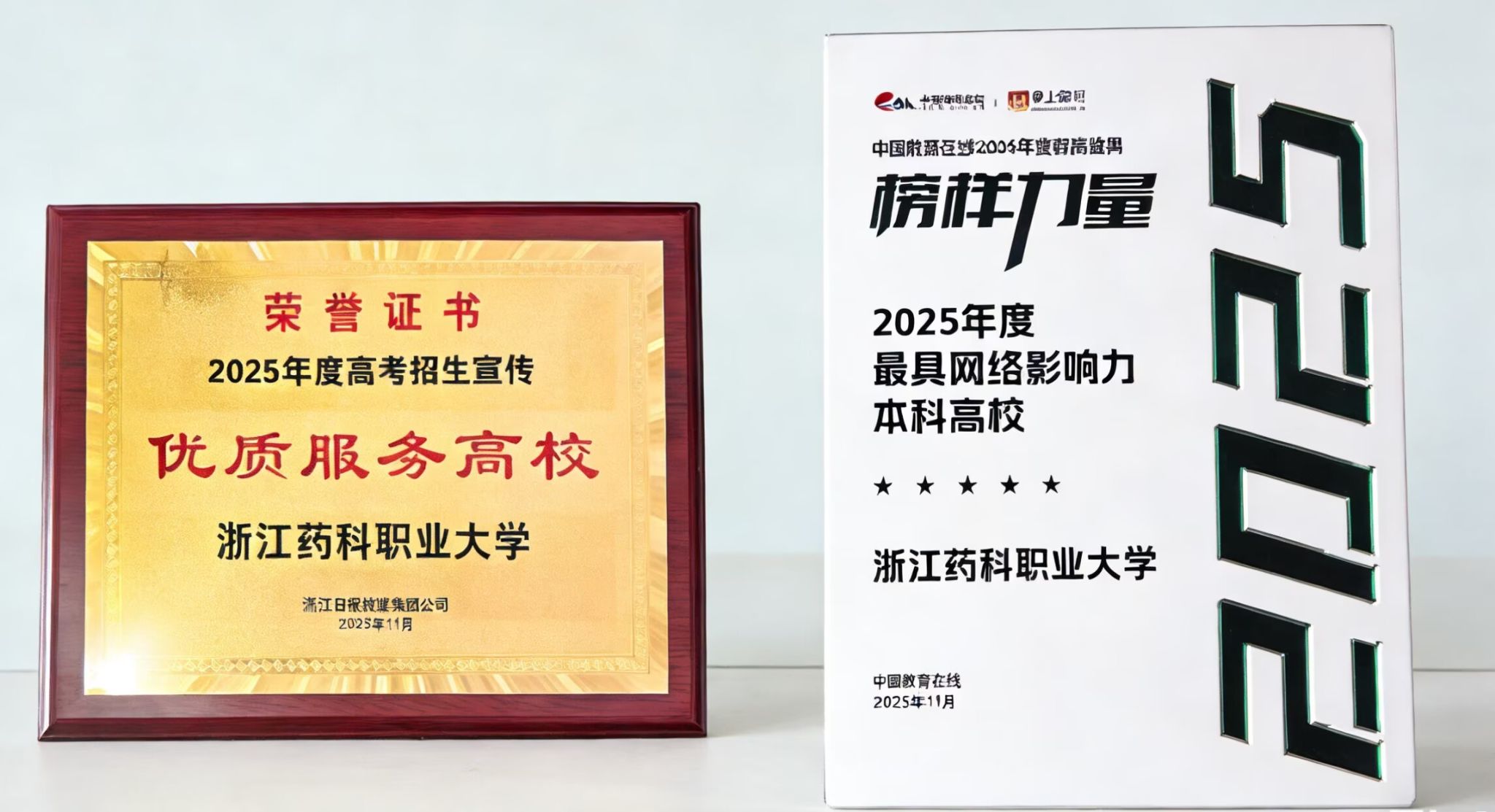 近日,我校招生宣传工作传来喜讯,凭借优质的宣传内容与广泛的传播成效,接连斩获两项高含金量荣誉。在浙江日报主办、浙江省教育考试院等支持的升学交流研讨会上,学校获评“2025年招生宣传优质服务高校”。此外,在中国教育在线主办的“榜样力量·2025年度教育盛典”活动评选中,学校亦斩获全国“2025年度最具网络影响力本科高校”称号。荣誉的取得,既是学校综合实力的有力证明,也直接反映了在网络影响力提升与招生策略优化上的显著成果。