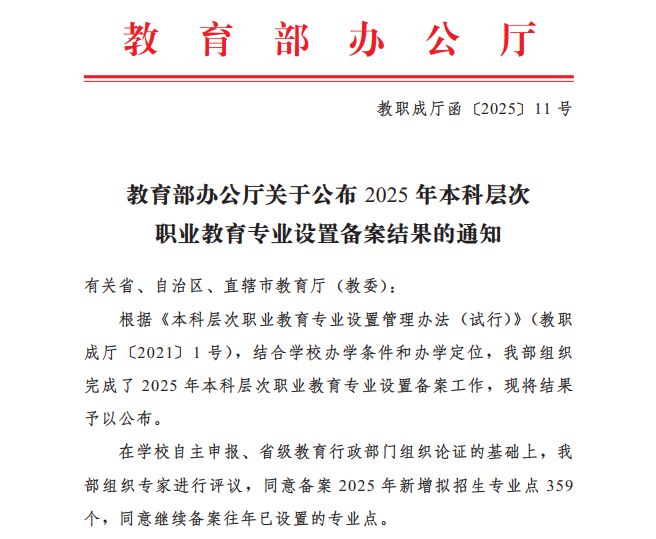4月24日,教育部发布《关于公布2025年本科层次职业教育专业设置备案结果的通知》(教职成厅函〔2025〕11 号),公布了今年新增的拟招生职业本科专业。我校申报的医养照护与管理四年制职业本科专业成功获批。截至目前,我校具有招生资格的四年制职业本科专业增至23个,两年制专升本专业已达19个。